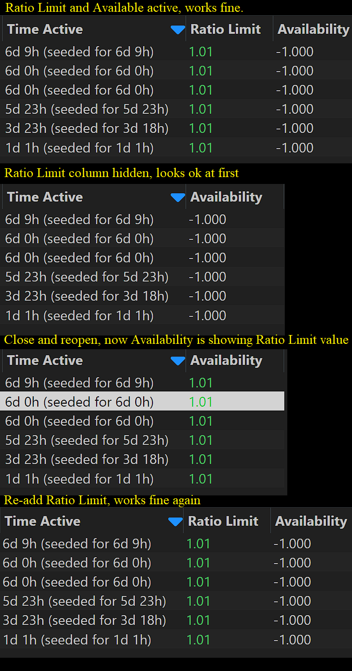 The issue only appears to present itself if the Ratio Limit column is NOT selected/enabled. If it is not enabled, then the Availability column uses the ratio value. If the Ratio Limit column Is selected/enabled, then the Availability column works correctly. You may need to F5/reload the page for the changes to be reflected.